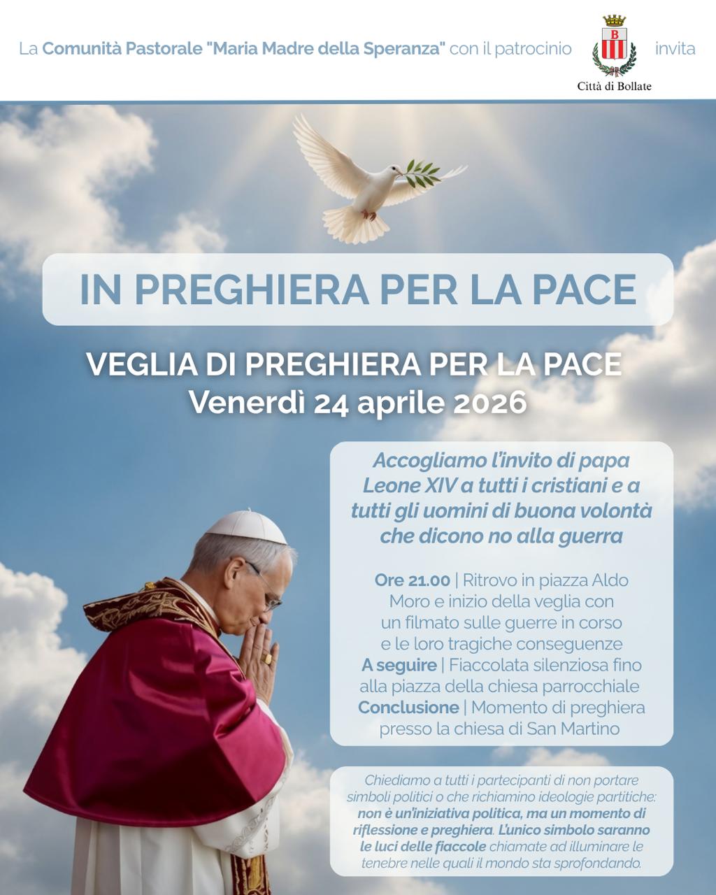 La Parrocchia, con la collaborazione del Comune, promuove una Veglia per la Pace, in programma venerdì 24 aprile alle ore 21.00, con ritrovo e partenza dalla piazza del Comune.